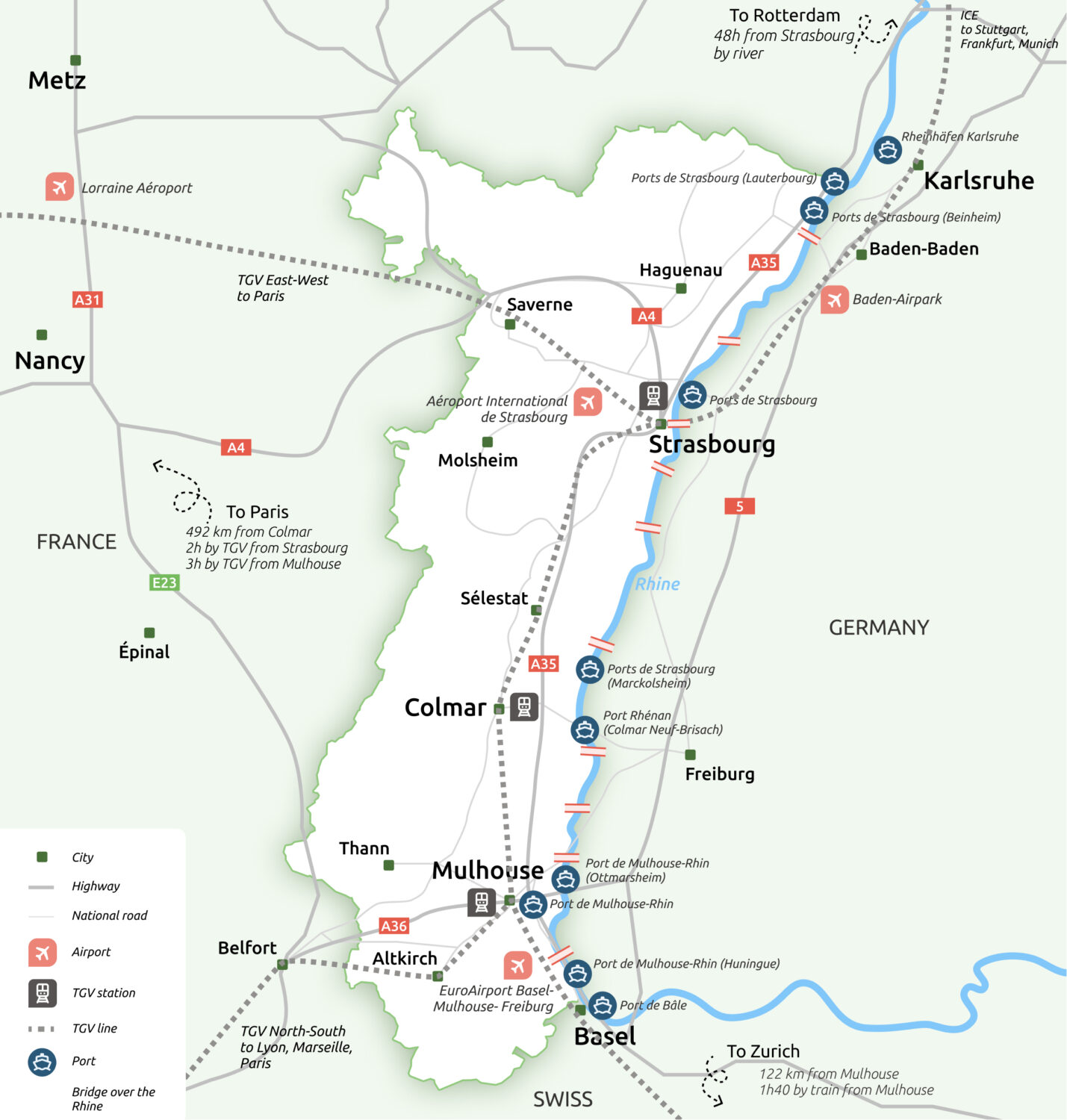 The Upper Rhine region in Europe is a key economic and demographic hub, with 100 million inhabitants and accounting for 30% of the European Union’s total GDP. Alsace, situated at the heart of this region, naturally serves as a central point for freight transport.