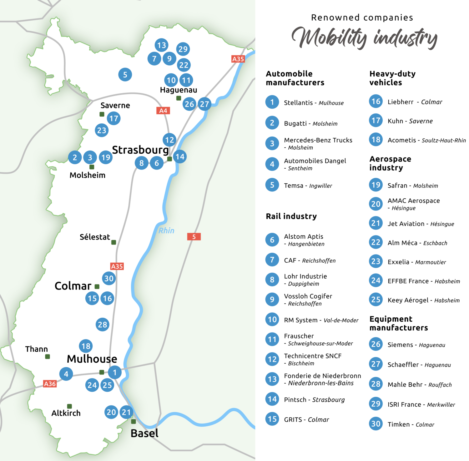Alsace’s prime geographical location has once again proven advantageous. Within a 300 km radius, you’ll find major historical European automobile manufacturers like Mercedes-Benz, Stellantis, MAN, Porsche, and Audi. This proximity has led to the development of a robust network of subcontractors in Alsace, supplying key vehicle components. Renowned companies such as Bugatti, Alstom, Lohr, and De Dietrich also have their roots in this region.
